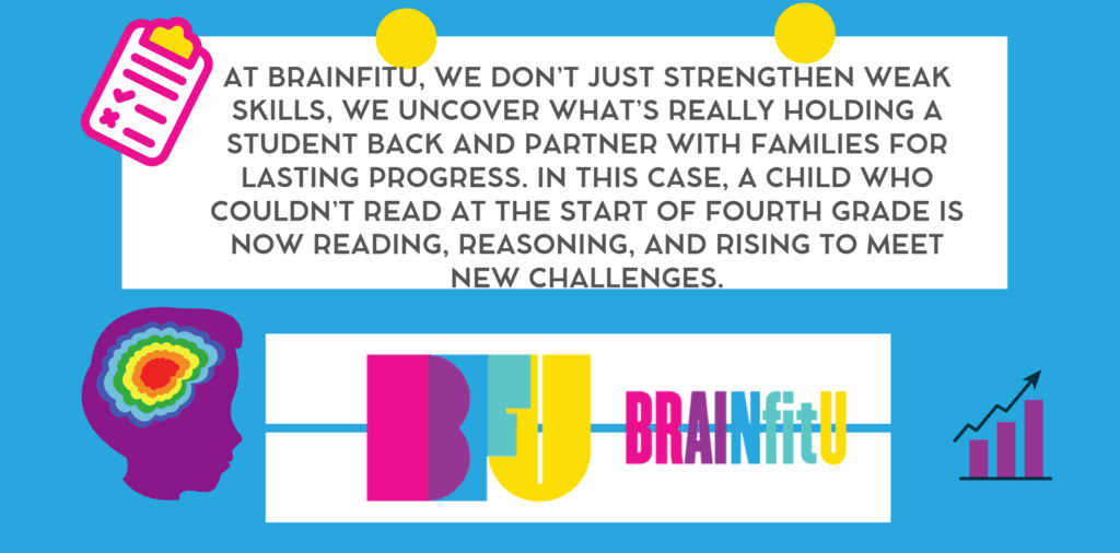 At BRAINfitU, we don’t just strengthen weak skills, we uncover what’s really holding a student back and partner with families for lasting progress. In this case, a child who couldn’t read at the start of fourth grade is now reading, reasoning, and rising to meet new challenges.