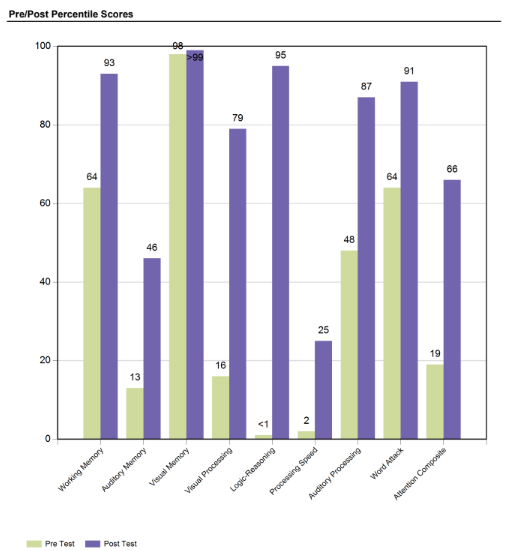 Chart 3A shows the students major changes from being Very Low and Low in all areas to only being Low in Processing speed. His Memory and Logic-Reasoning skills, went all the way to Superior scores, his visual processing went to Above Average. His Auditory Processing and Word Attack are now high, making it so that he hears the words and understands the sounds, previously when he heard sounds they were not making sense to him to be able to decode new words. It was no wonder he could not read! His attention composite went to Above Average making it so that his attention and ability to focus to stay on task are highly increased. These results make his trainers smile ear to ear!