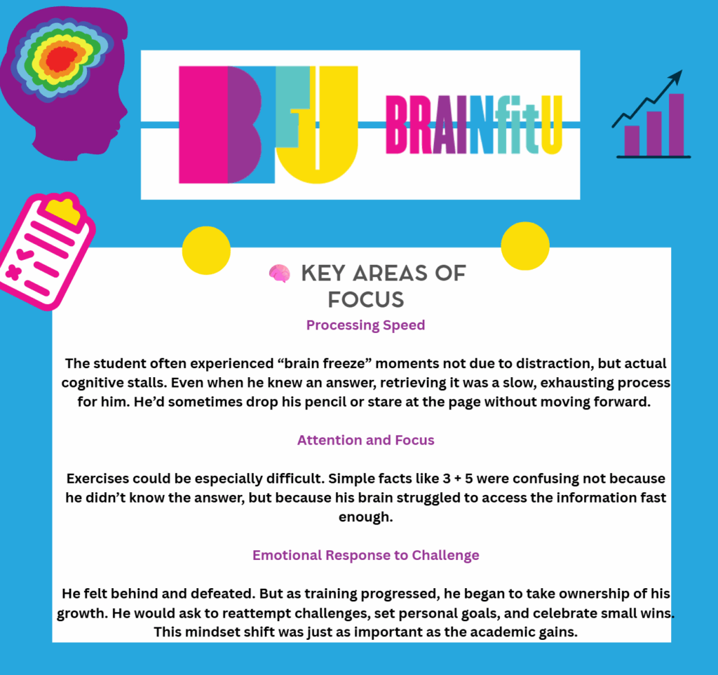 BRAINfitU’s strength-based, personalized model made a big difference. His trainer adapted sessions in real-time to support his stamina and engagement. Some areas that assisted him in his brain training included: